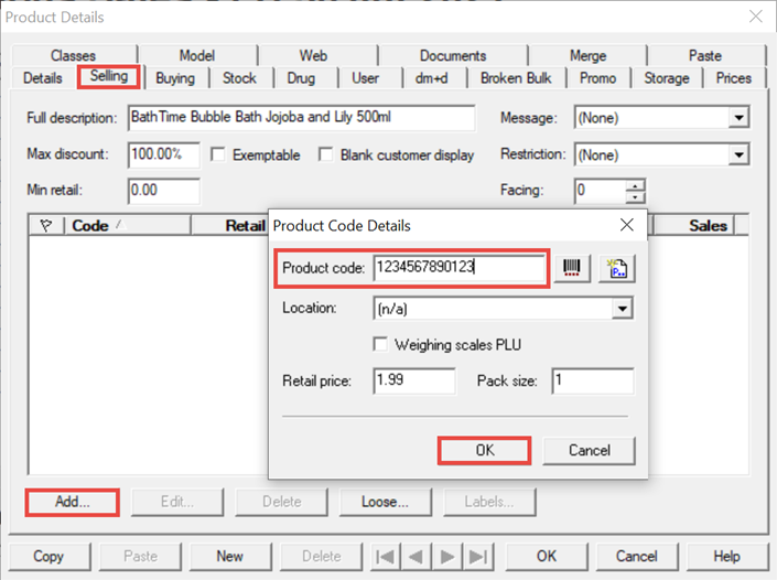 Finally, in the Selling tab add the bar code, this will make sure the product is recognised when it is scanned during a sale.